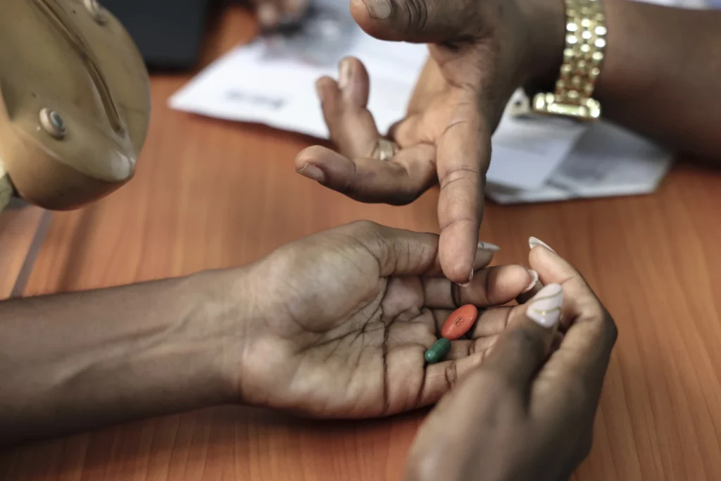 Hawanatu Samura or “Nurse Awa” instructs a patient to take medication ahead of an evacuation procedure at the Marie Stopes Sierra Leone Reproductive Choices clinic in Freetown, Sierra Leone, Thursday March 3, 2025. (AP Photo/Caitlin Kelly)