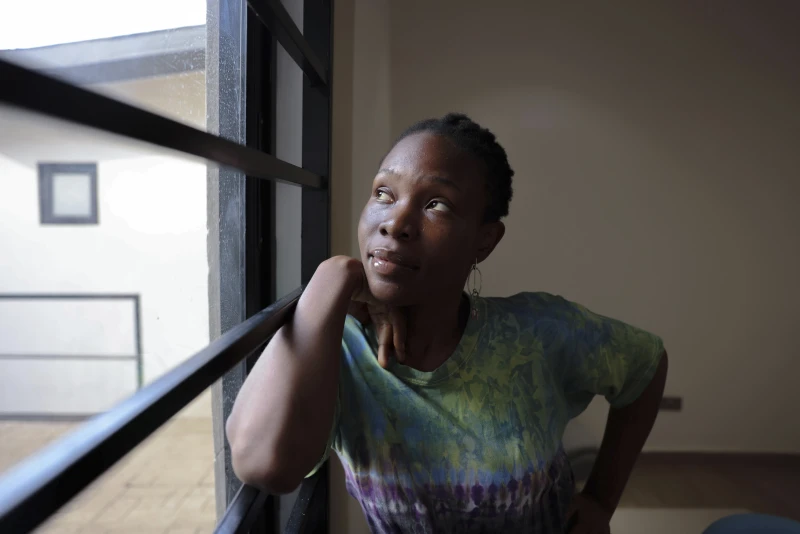 Fatou Esther Jusu poses at headquarters of feminist group Purposeful in Freetown, Sierra Leone, Thursday March 3, 2025. (AP Photo/Caitlin Kelly)